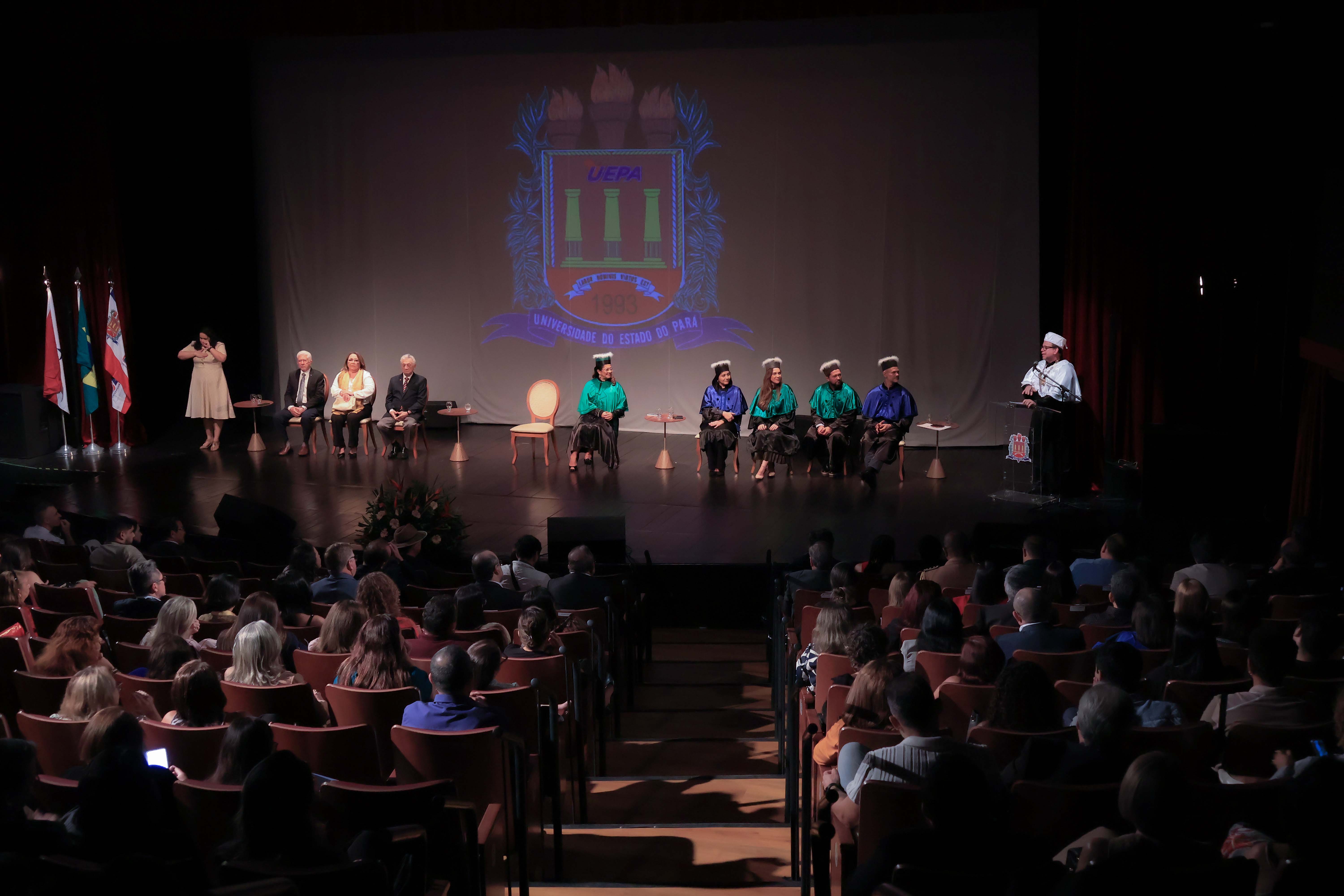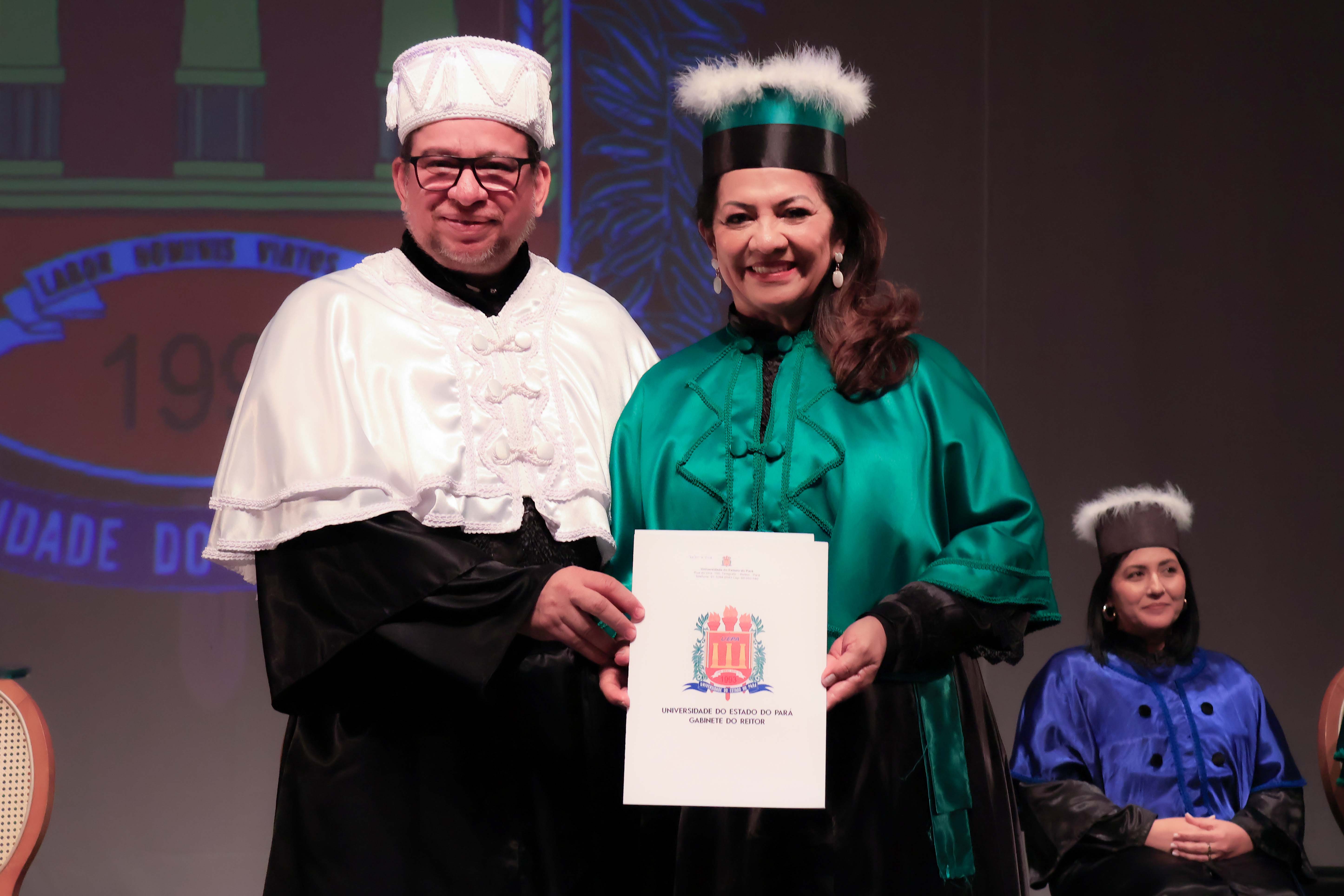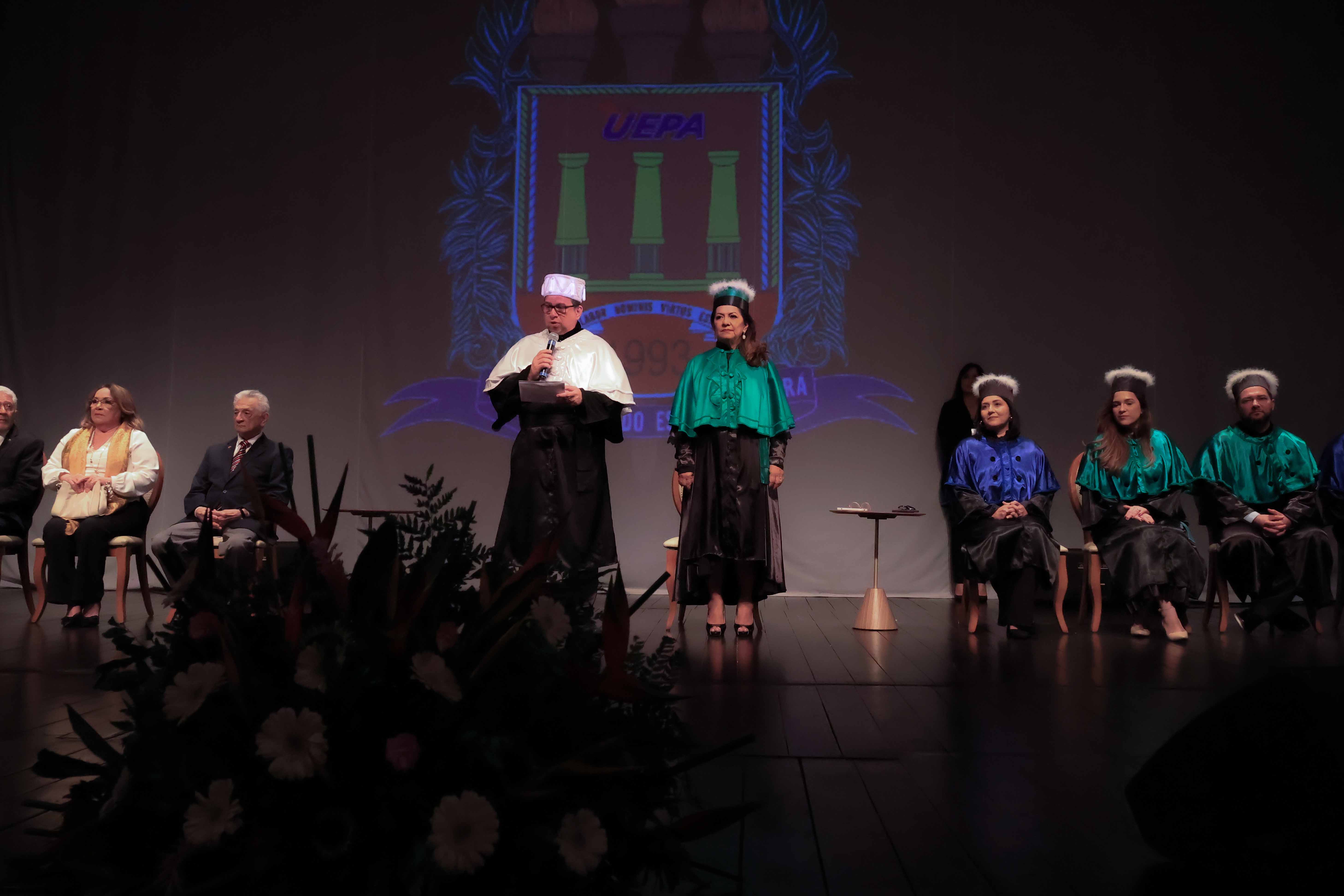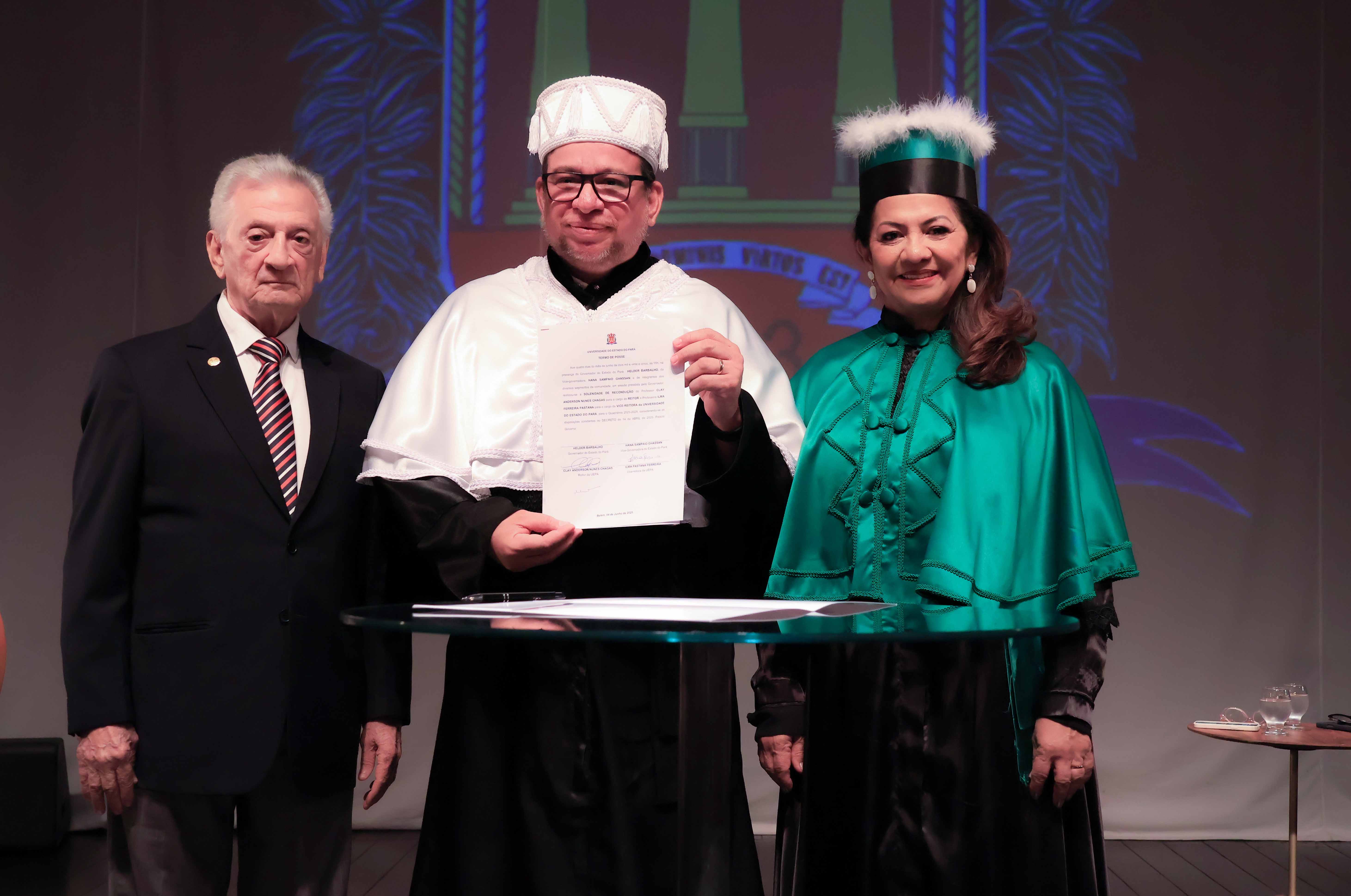 Em um evento carregado de emoção, simbolismo acadêmico e reafirmação do compromisso com a educação pública de qualidade, a Universidade do Estado do Pará (Uepa) reconduziu oficialmente, nesta quarta-feira, 4, o reitor Clay Chagas e a vice-reitora Ilma Pastana para mais um mandato à frente da instituição. A cerimônia foi realizada no Teatro Margarida Schivasappa, em Belém, e reuniu membros da comunidade acadêmica, ex-reitores, autoridades e representantes dos campi do interior.
