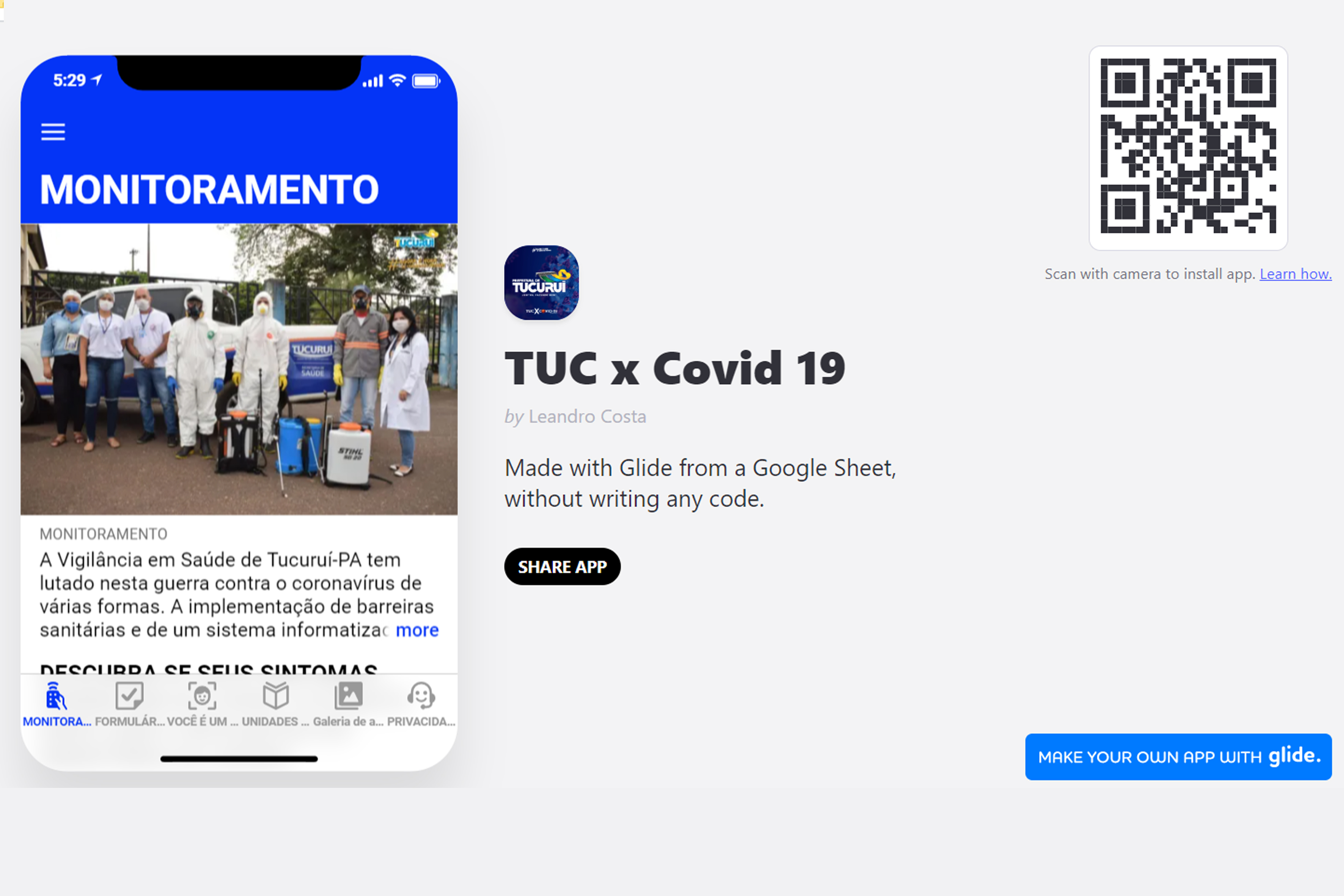 O aplicativo está disponível no link https://dzsjq.glideapp.io/ e começou a ser desenvolvido em março pelo professor da Universidade do Estado do Pará (Uepa), Leandro Costa, que também é aluno da Universidade no Mestrado Ensino em Saúde na Amazônia (ESA). Leandro Costa é, ainda, servidor efetivo da Prefeitura de Tucuruí, e atua como enfermeiro da Vigilância em Saúde. O Mestrado ESA incentivou Leandro a analisar a situação de risco em que se encontra o município, pesquisar e desenvolver um aplicativo que foi colocado à disposição da Coordenação da Vigilância em Saúde de Tucuruí para aprovação e utilização sem nenhum custo. A Coordenação aprovou a tecnologia, que passou a ser adotada oficialmente pela Prefeitura.