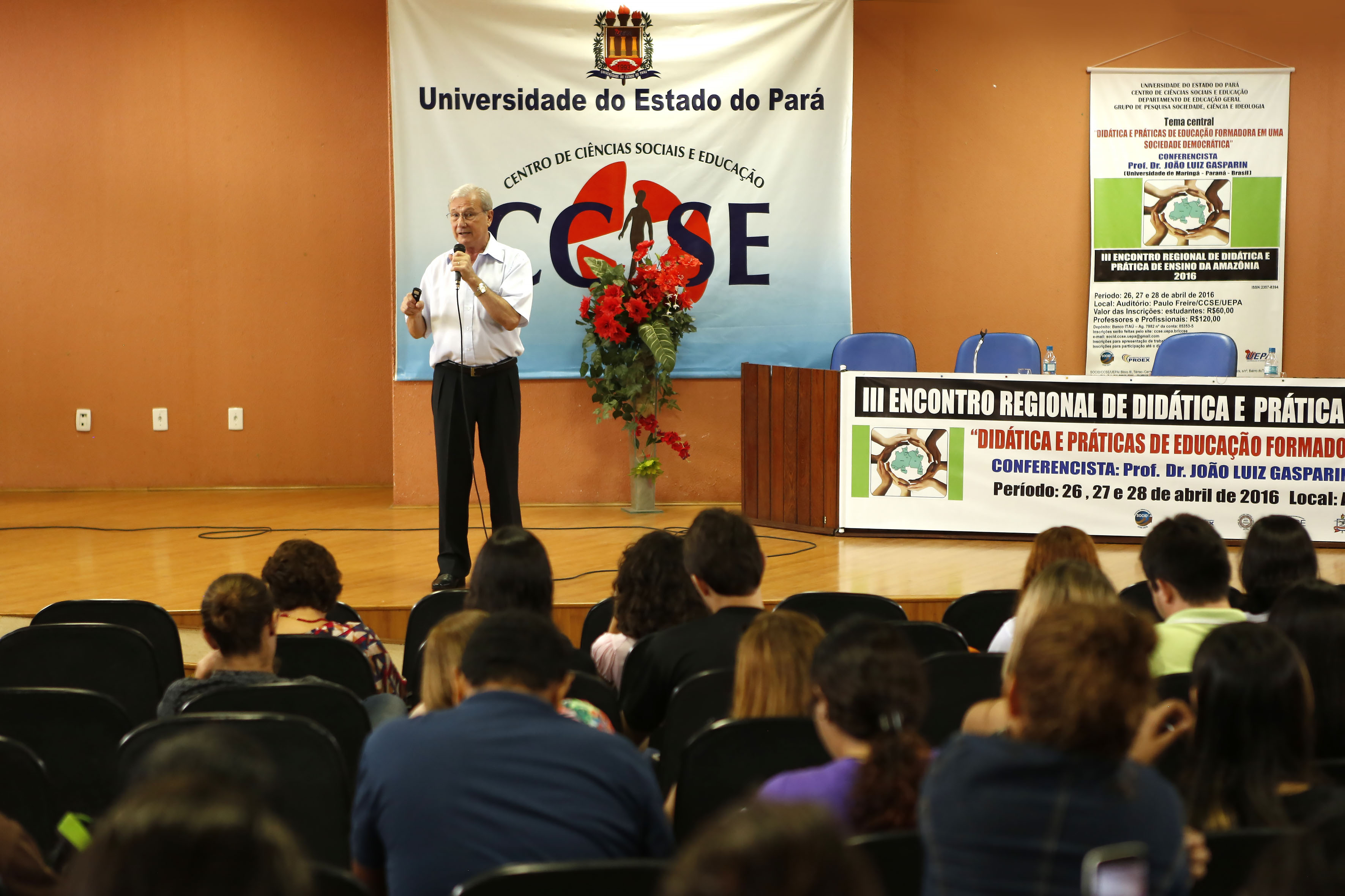 Com o objetivo de promover a reflexão entre docentes e futuros docentes acerca do modelo de ensino atual, o III Encontro Regional de Didática e Prática de Ensino da Amazônia (Erdipea), organizado pelo Grupo de Pesquisa Sociedade, Ciência e Ideologia (Socid) da Universidade do Estado do Pará (Uepa), iniciou suas atividades na manhã de hoje (26). O professor doutor João Luiz Gasparin, da Universidade Estadual de Maringá (UEM), abriu o evento com a conferência “Didática e Práticas de Educação Formadora em uma Sociedade Democrática”, onde propôs para os presentes uma abordagem alternativa para o ensino tradicional em sala de aula. O encontro segue até quinta-feira, 28, no Auditório Paulo Freire, do Centro de Ciências Sociais e Educação (CCSE).