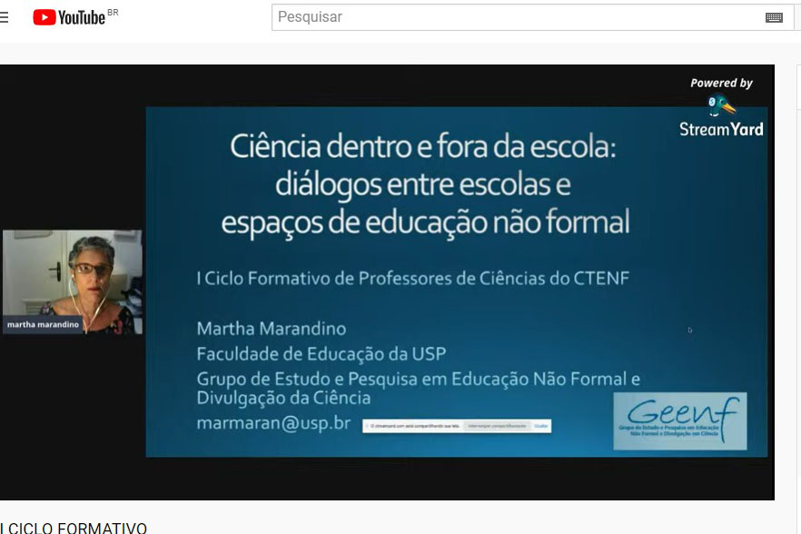 Martha Marandino destacou a atual situação dos espaços museais e dos profissionais da área, já que devido à pandemia do novo Coronavírus (Covid-19) esses locais foram fechados para evitar aglomerações. “No primeiro momento, esse parecia ser o lado mais fraco, porque, não tem público, mas no momento seguinte houve logo uma percepção, fruto do trabalho dos educadores, da importância desses profissionais nas redes sociais”, explicou ela que, completou: “Fico feliz de ver como a gente, como grupo, como a gente tem resistido e isso não deixa de ser uma mensagem de esperança para todos nós. A gente tá produzindo ações interessantes para os diferentes tipos de público”.