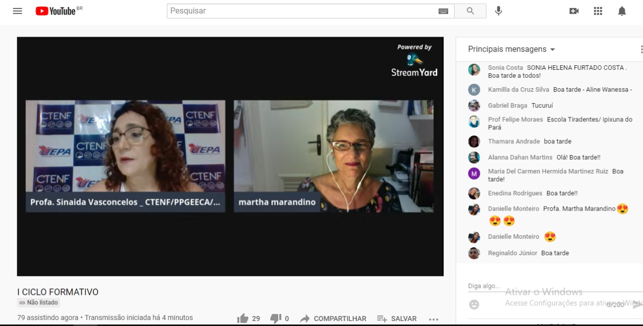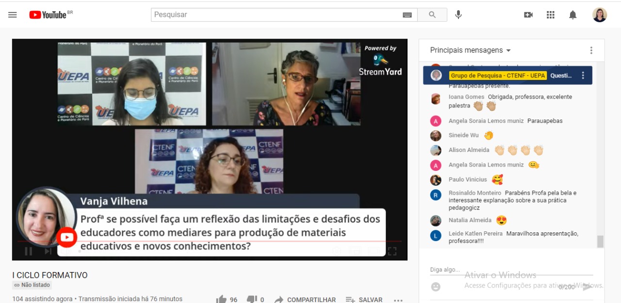 Com a mediação da professora da Uepa e líder do CTENF, Sinaida Vasconcelos, o primeiro momento foi de agradecimento ao público que estava acompanhando a live, formado por educadores e pesquisadores de vários municípios do Pará, entre eles, Parauapebas, Marabá, São Miguel do Guamá, Barcarena e Tucuruí.