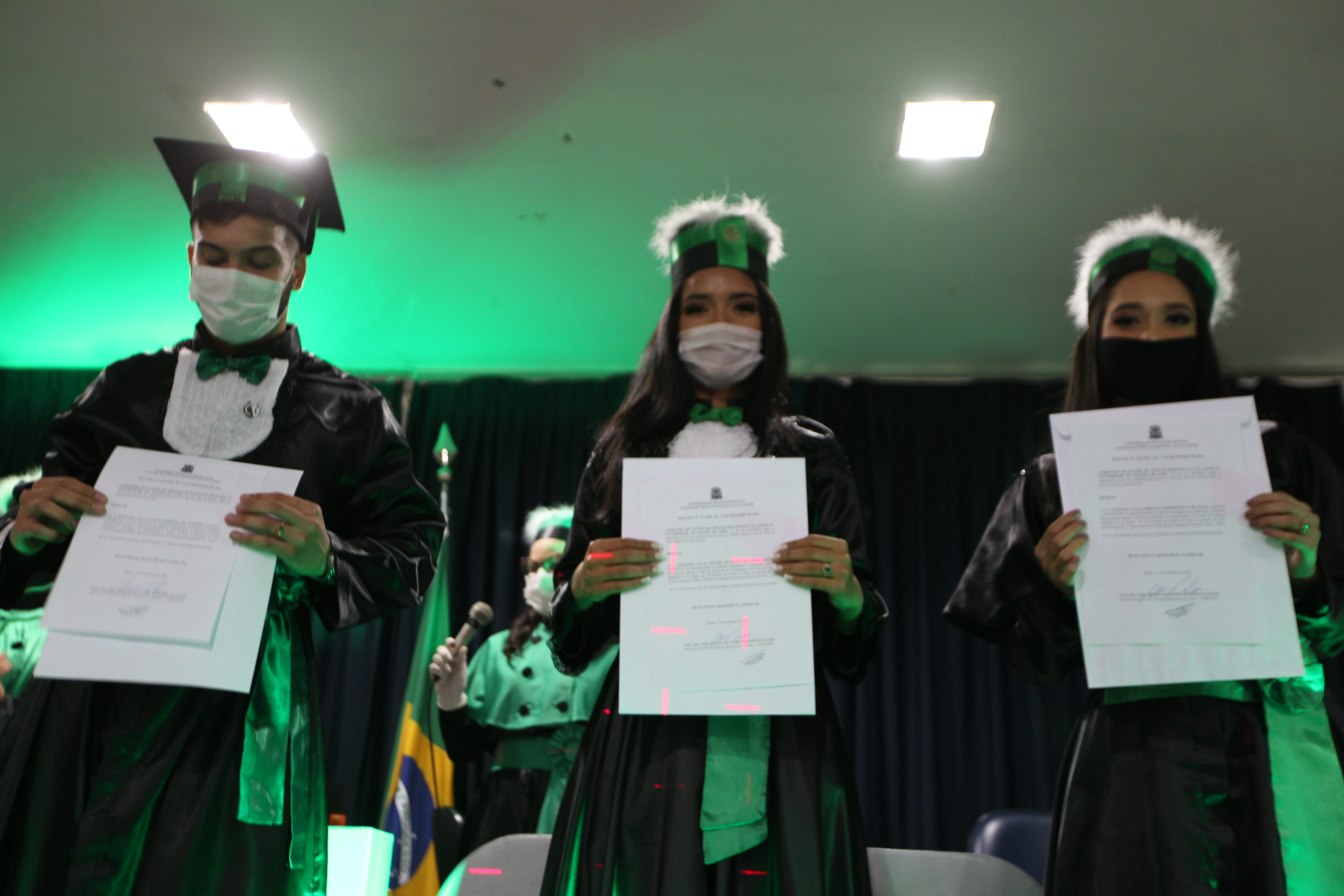No contexto atual de pandemia do novo Coronavírus (Covid-19) é impossível realizar uma formatura acadêmica com todos os tradicionais elementos que o momento requer. A festa e os abraços de felicitações ao universitário, pela jornada concluída, ficarão para outro momento. Porém, a felicidade sempre se faz presente entre os recém-formados e familiares. E, na última quinta-feira, 17 de dezembro, não foi diferente para trinta e quatro discentes do Curso de Enfermagem, que solicitarm a antecipação do diploma. A entrega foi realizada no auditório da Unidade de Ensino e Assistência em Fisioterapia e Terapia Ocupacional (Ueafto), no Centro de Ciências Biológicas e da Saúde (CCBS), seguindo as diretrizes de distância e de uso de máscaras de proteção individual, recomendadas pela Organização Mundial da Saúde (OMS).