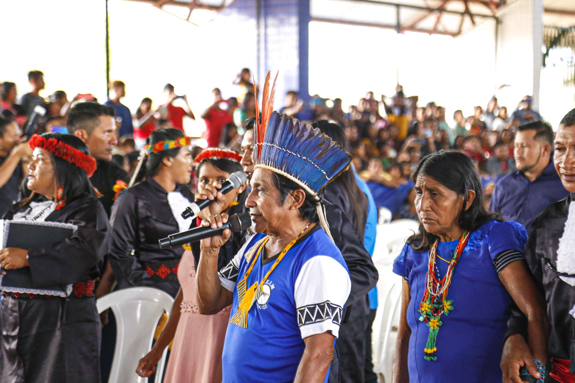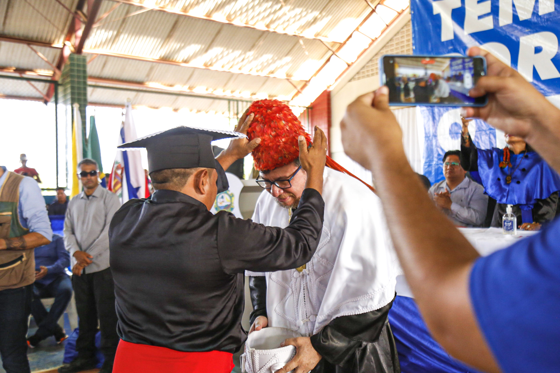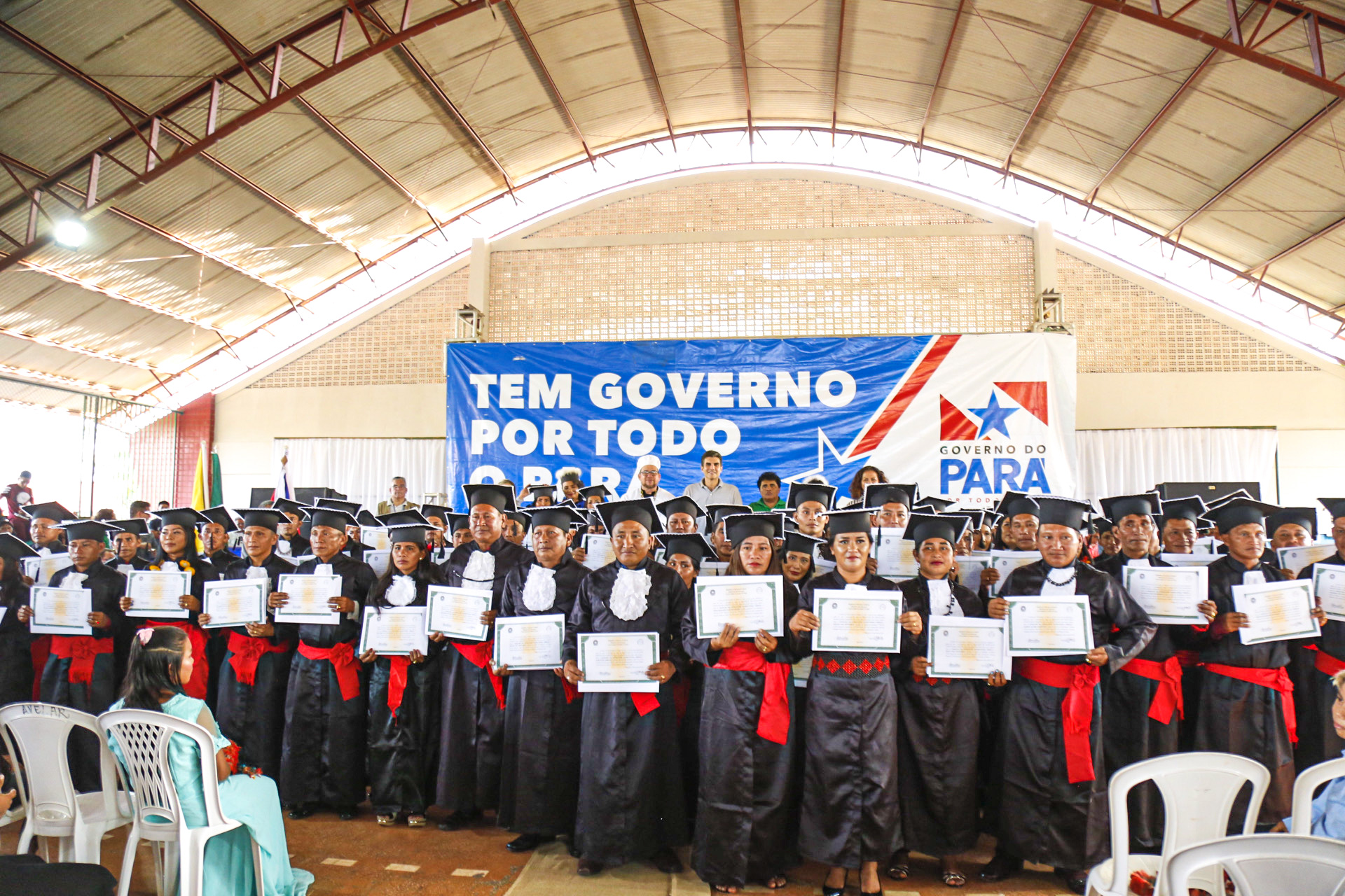 Um canto Munduruku ecoou na tarde de ontem, 8, no Ginásio Poliesportivo do município de Jacareacanga, para celebrar a formatura de 74 indígenas da etnia Munduruku do Alto Tapajós em Licenciatura Intercultural Indígena, pela Universidade do Estado do Pará (Uepa). E foi com um tradicional adorno de cabeça, complementando as tradicionais vestes talares, que o reitor da Uepa, Clay Chagas, realizou a outorga de grau dos novos egressos da instituição.