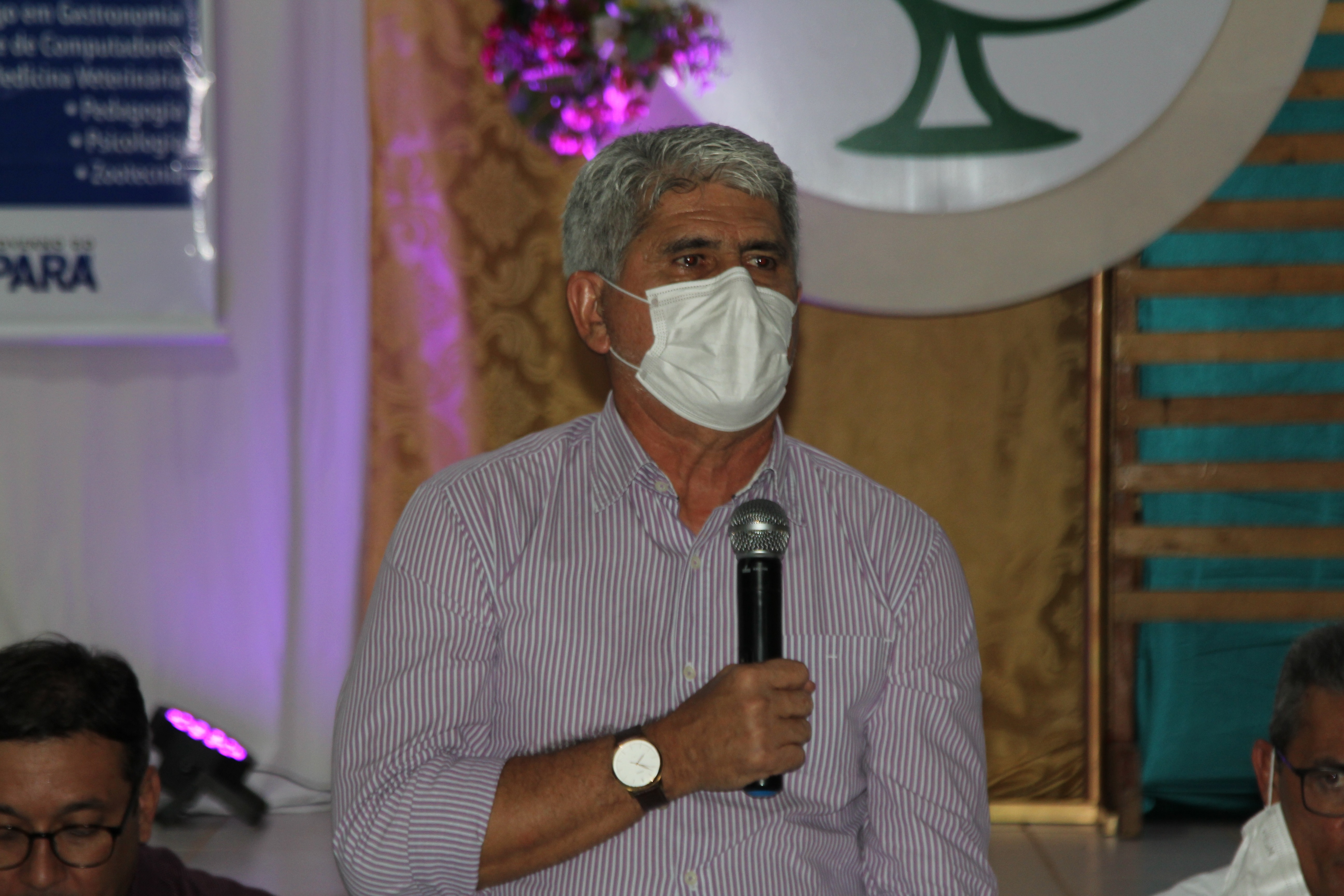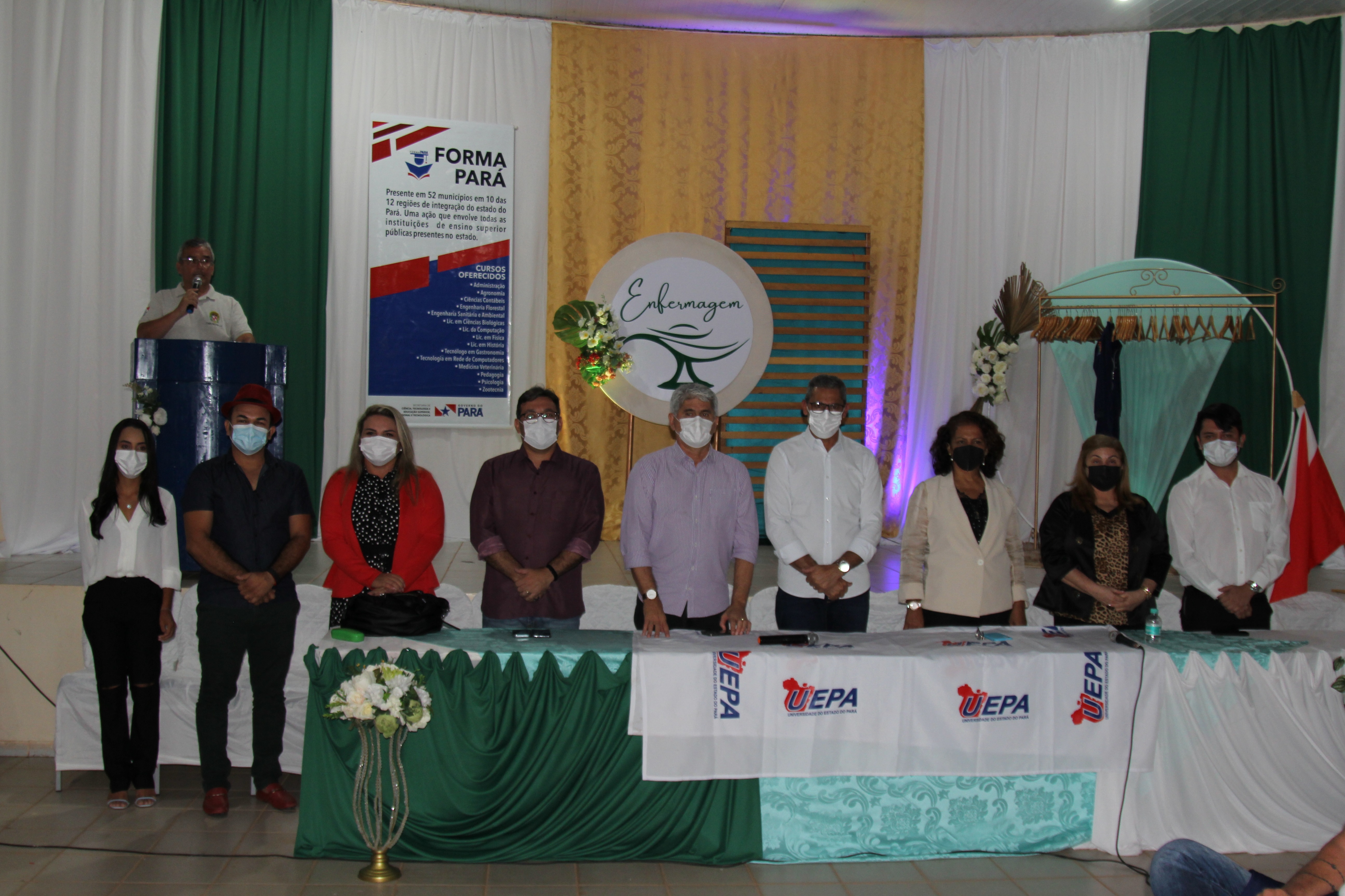 A mesa de abertura da aula contou com a participação do secretário titular da Sectet Carlos Maneschy, a vice-reitora da Uepa, Ilma Pastana, a vice-diretora do Centro de Ciências Biológicas e da Saúde (CCBS), Simone Beverly, o coordenador adjunto do curso de enfermagem pelo Forma Pará, Junior Veloso, o prefeito de Goianésia, Leonardo Menezes, o secretário municipal de educação de Goianésia, Lindomar Pereira e a representante do Polo Educativo de Goianésia, Cristina Lima.