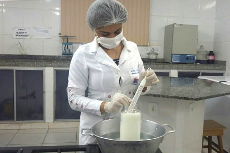 len Silva, conta como funciona o processo de desenvolvimento no laboratório do campus. “Nós analisamos o pH do leite antes da verificação e, quando o leite fica apto ao consumo, nós abaixamos o pH para ele se tornar um iogurte. Após isso, acrescentamos as polpas, levamos ao resfriamento e por fim realizamos a avaliação sensorial”, conclui ela.
