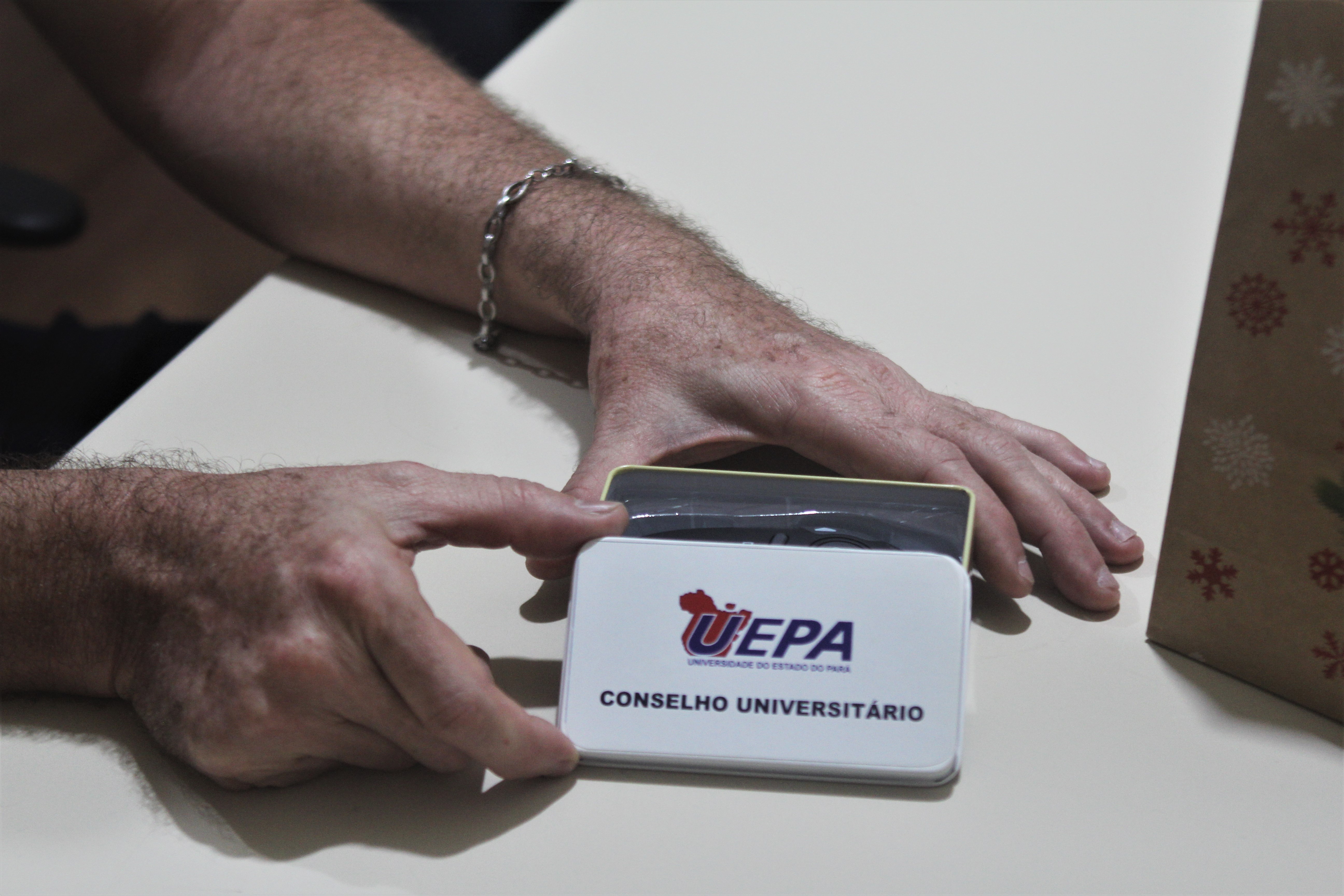 Mas, além de conhecimento e experiência, Germano também pode ter sua atuação profissional na Uepa definida por outro substantivo: DE-DI-CA-ÇÃO. Só alguém com muita dedicação faria algo assim para presentear os conselheiros do Consun com um brinde de final de ano: “Ah, isso aqui é um pointer laser, mas não veio nessas caixinhas. Essas caixas eu comprei e pintei uma por uma, depois pedi para o seu Rômulo imprimir a logo da Uepa em uma folha, recortei uma por uma e adesivei na caixa”.